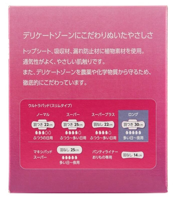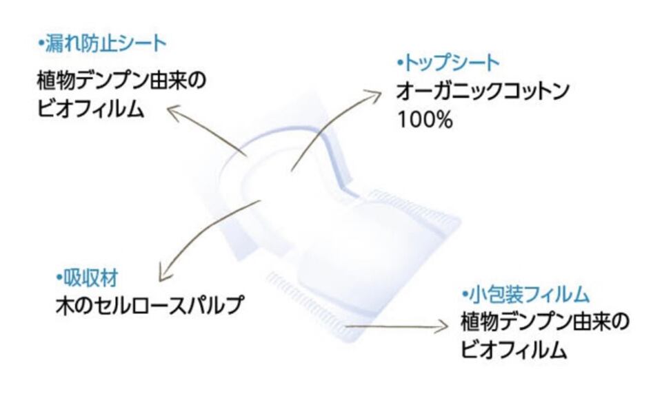 成分・原材料表面材:コットン(オーガニックコットン100%)、吸収剤:セルロースパルプ、個装:ビオフィルム<植物由来、生分解可能>